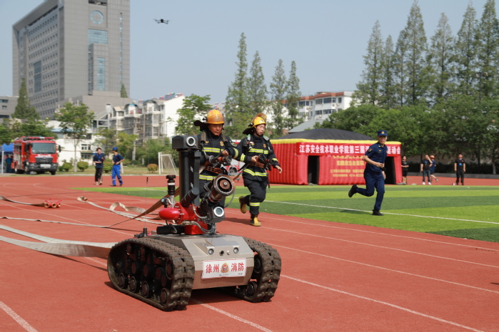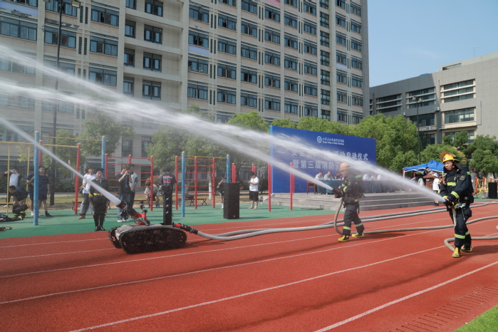 在消防救援风采展示环节,云龙区消防救援大队队员与我校相关专业学生通力合作,精彩呈现了消防疏散物资与机器人侦查灭火操科目演示。在消防疏散物资演练中,消防队员与同学们配合默契,以规范专业的动作、高效有序的协作,快速完成模拟障碍物的安全转移,生动展现了科学处置火灾风险源的标准流程。机器人侦查灭火操则带来震撼的科技体验,智能消防机器人灵巧穿梭于模拟火场,依托先进传感系统精准定位火源,同时,消防队员带来的水枪协同作战以交替掩护战术实现快速控火。这场融合科技与实战的演示,让现场师生近距离感受到“智慧消防”的创新力量。
